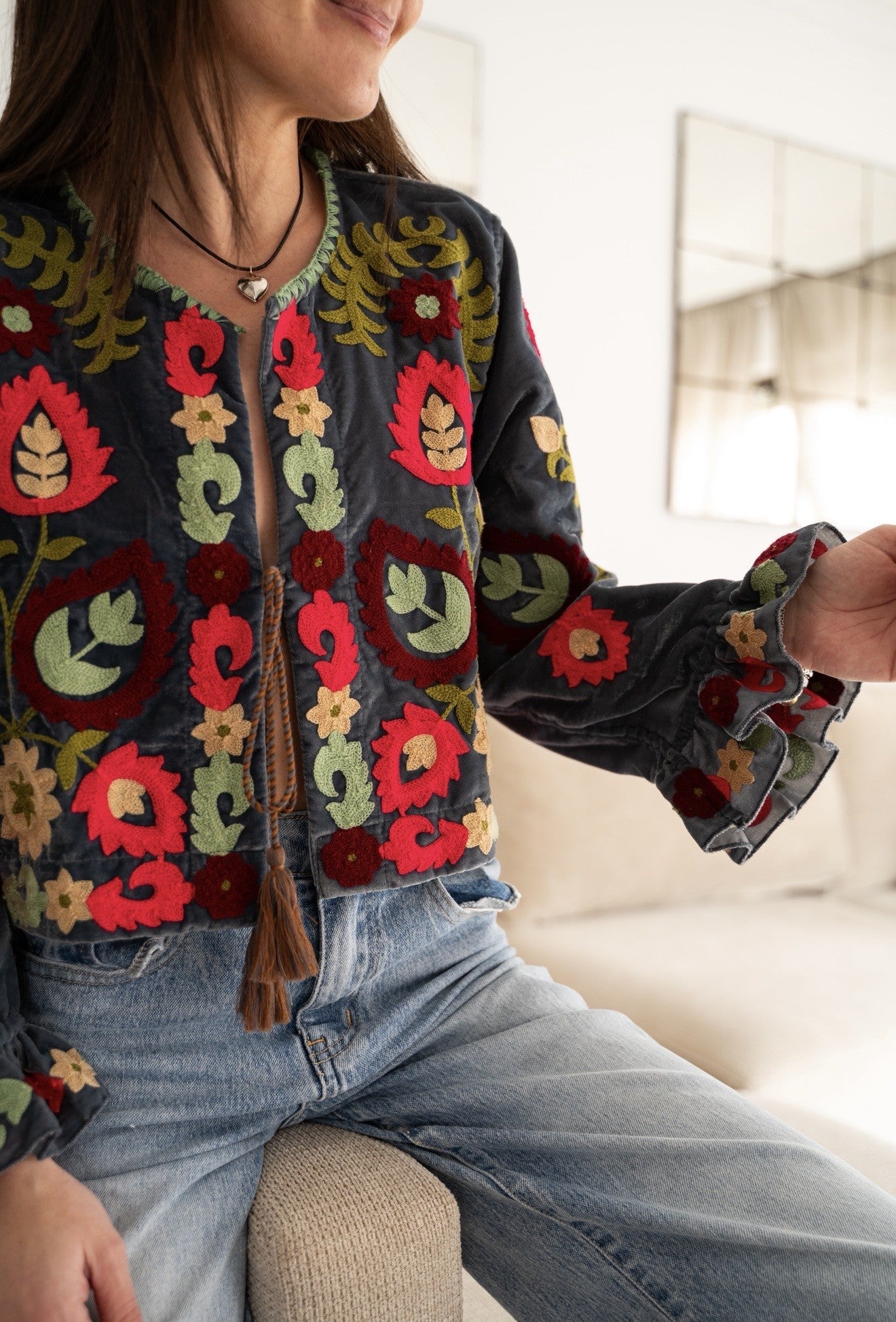 Preciosa chaqueta de terciopelo con flores bordadas. Edición limitada. Solo para los armarios mas especiales.