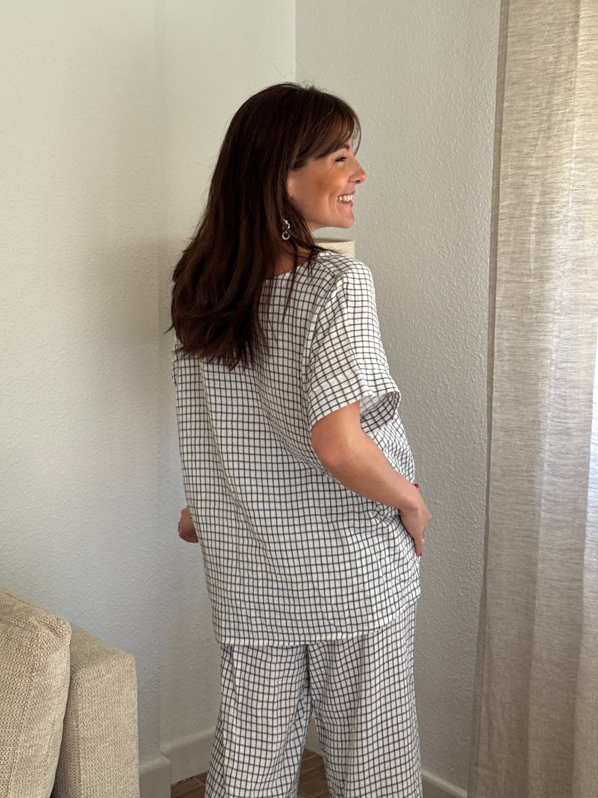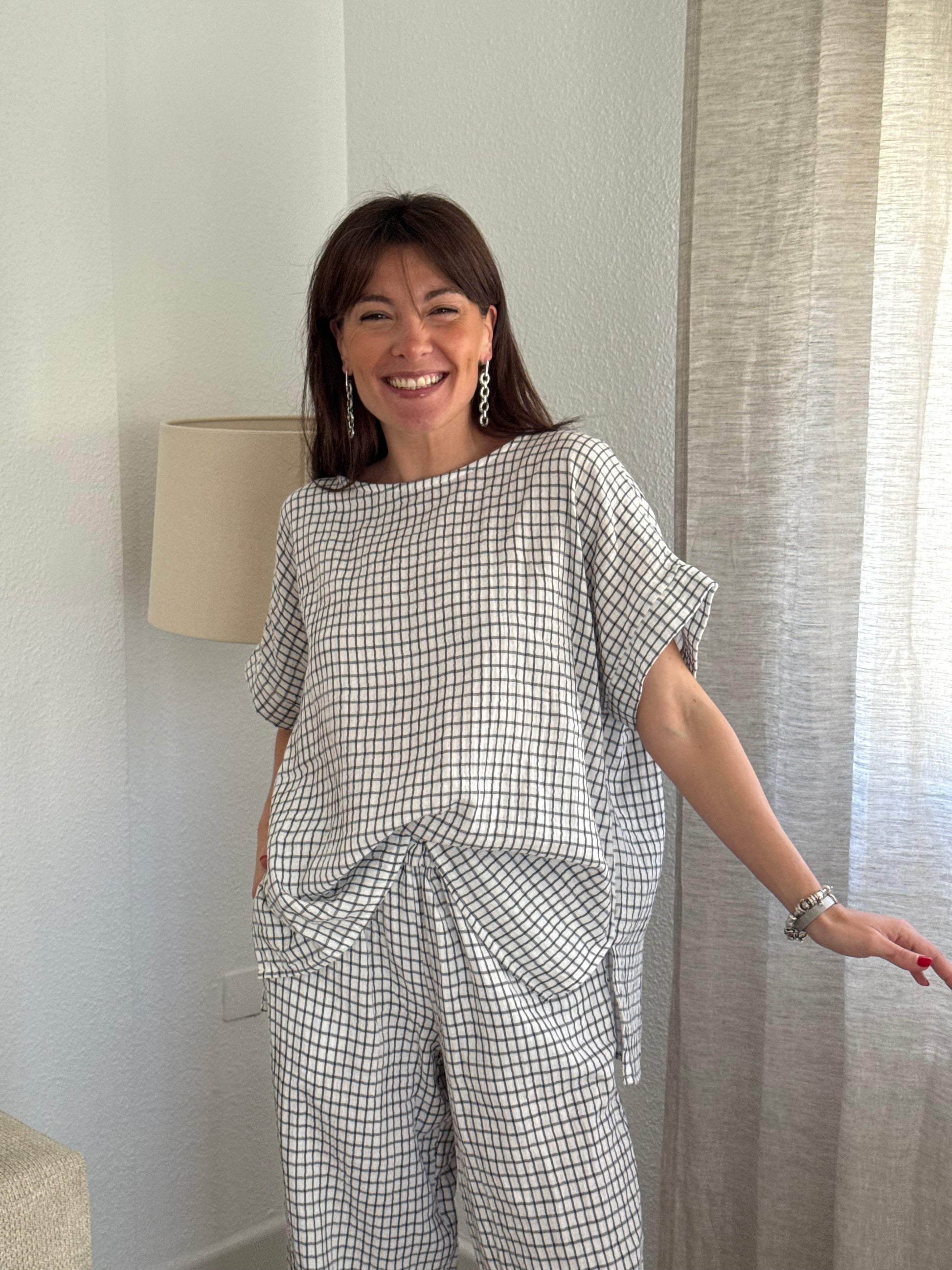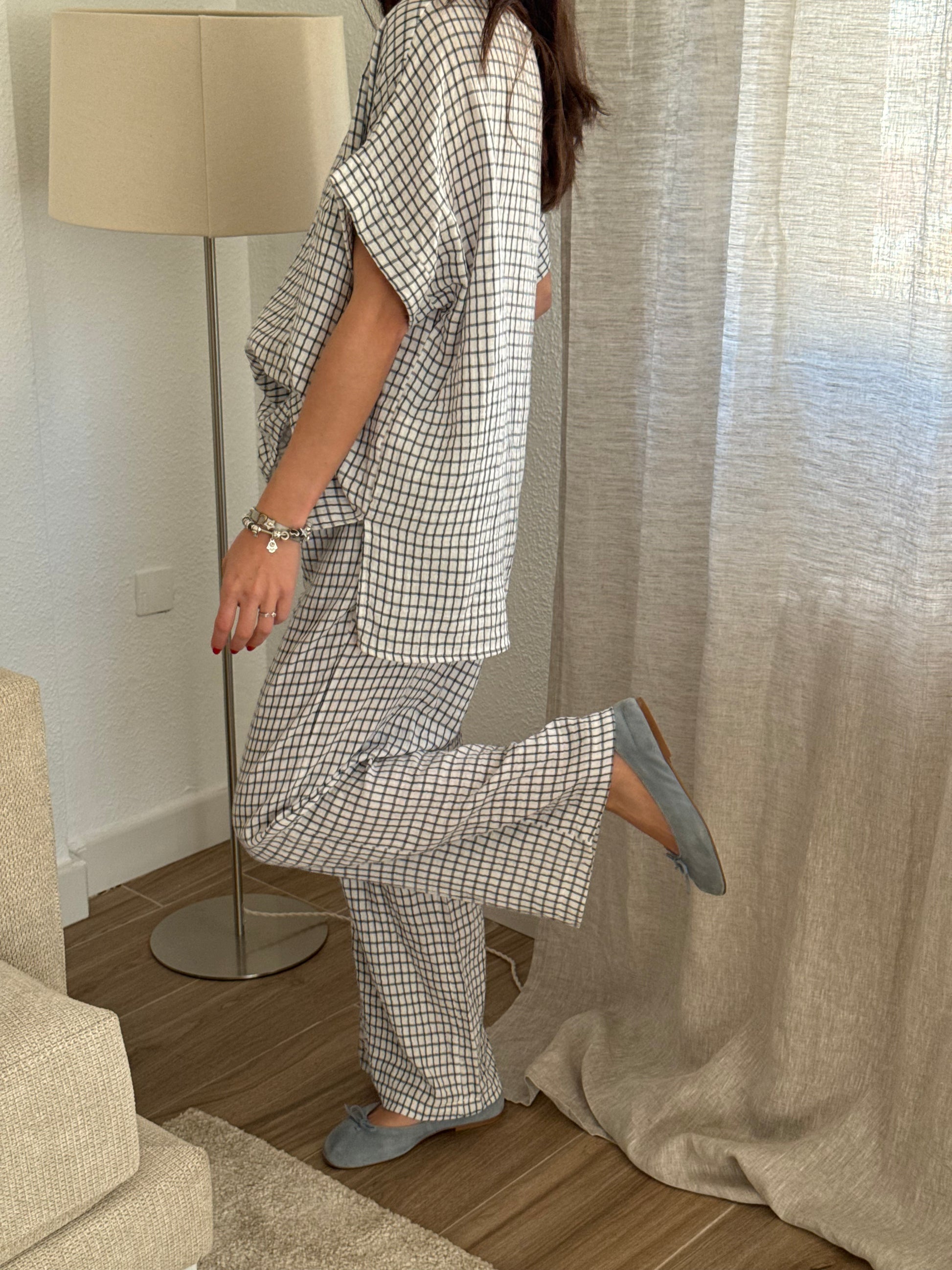Conjunto en tejido de muselina. Estampado de cuadros negros