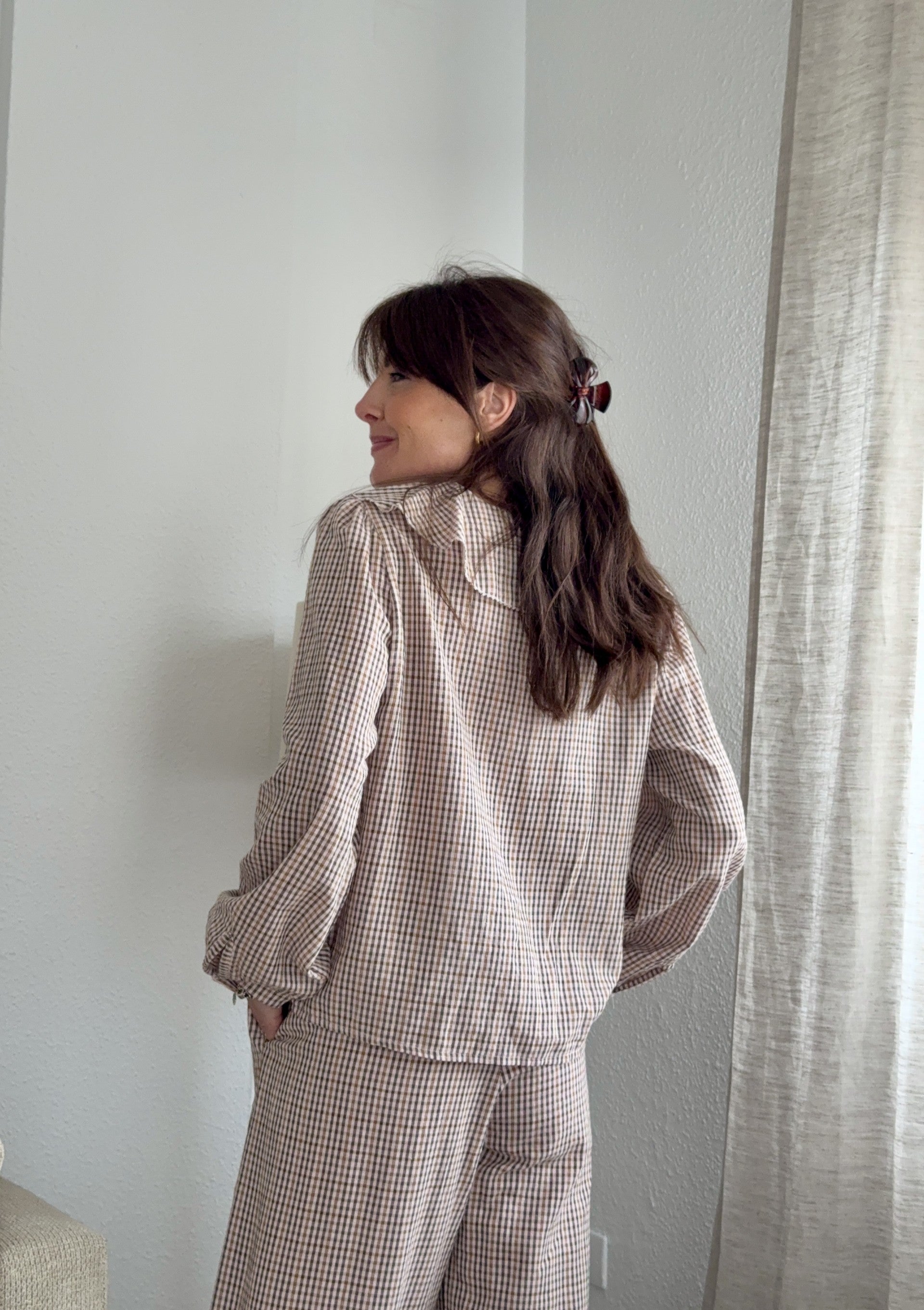 Conjunto rosa vichy con la parte de la camisa en volante y la parte del pantalón en pierna recta y de cuadro pequeño.