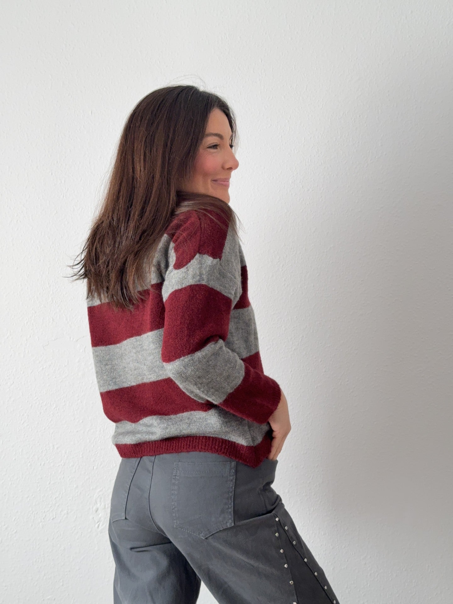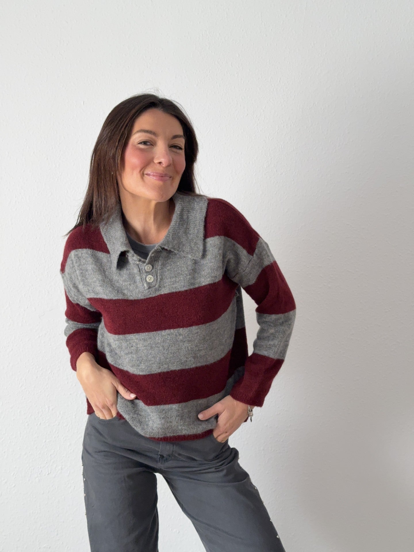 Jersey polo a rayas color burdeos y gris. Punto.