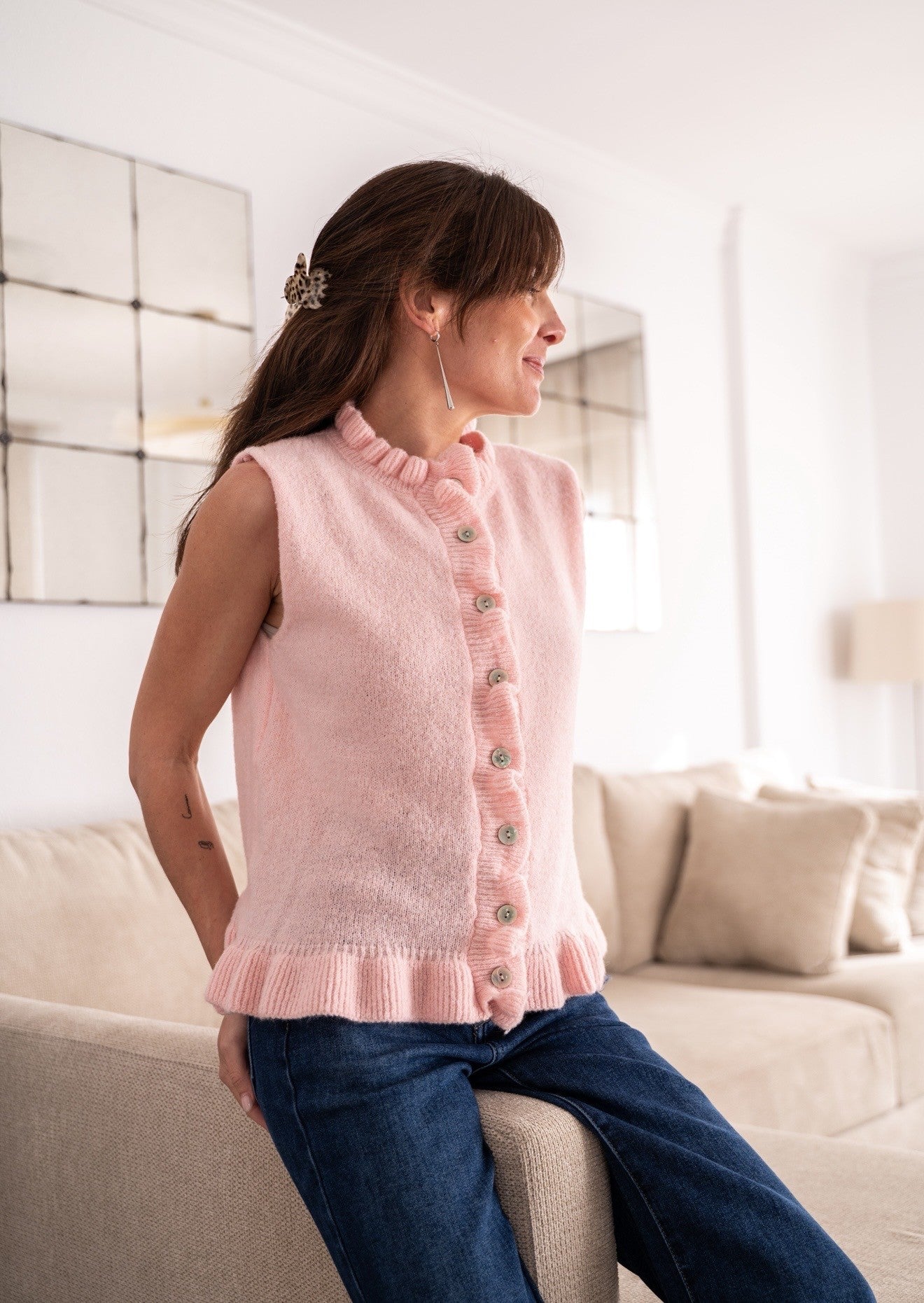Chaleco de punto, cuello hondas y bajo hondas. Totalmente abotonado.