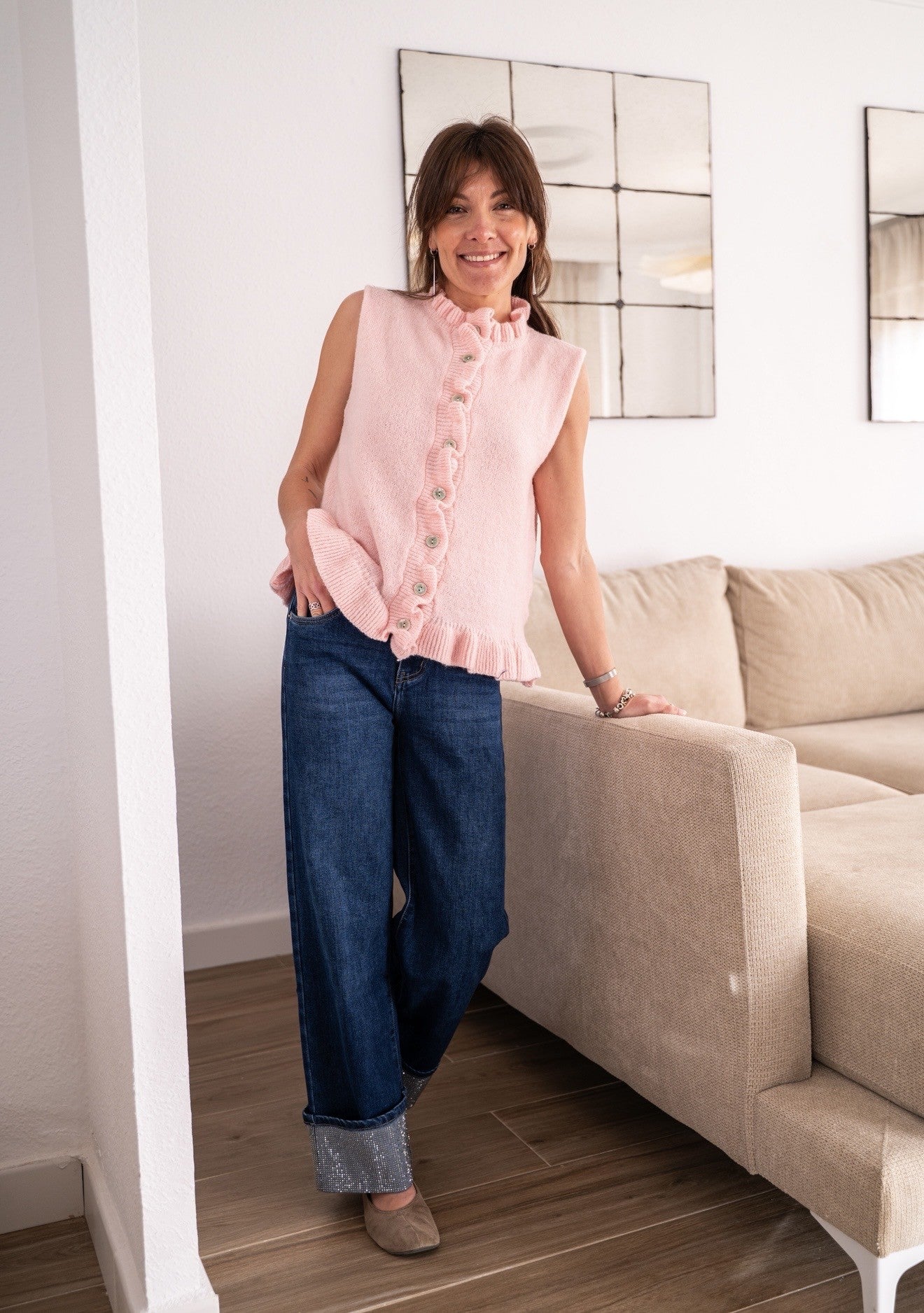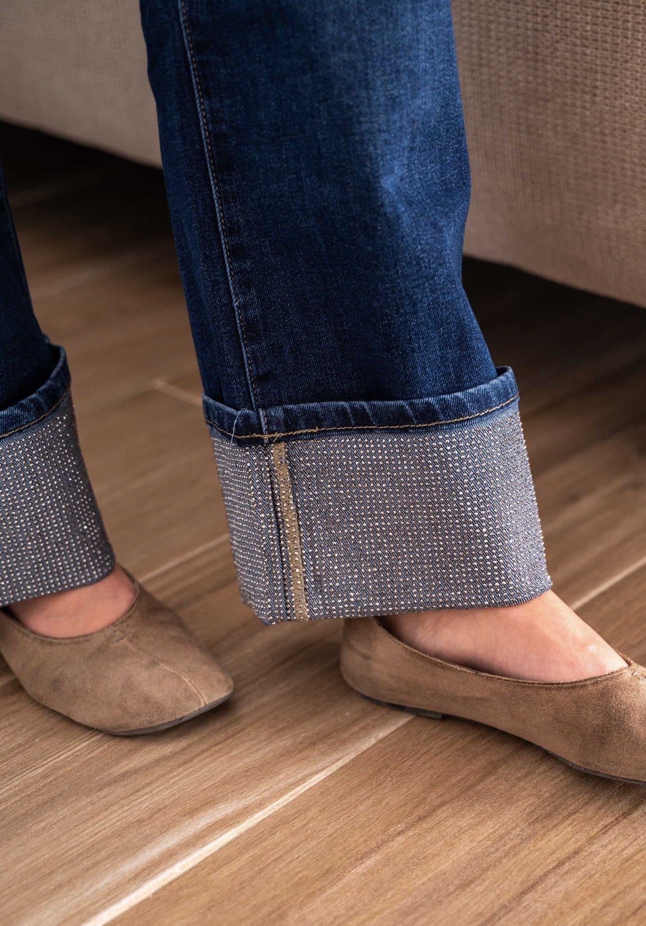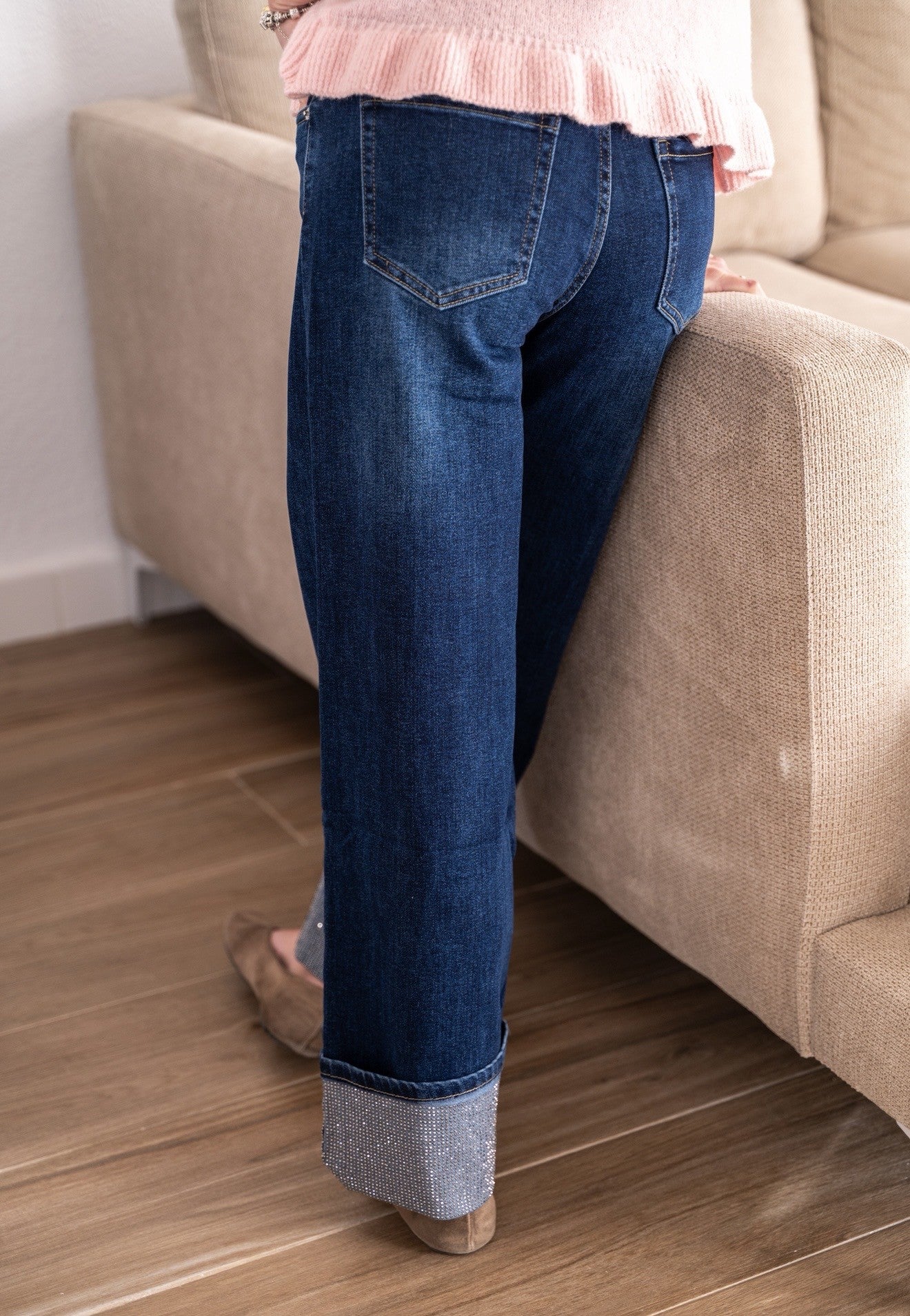 Vaquero de corte recto en color oscuro con dobladillo de brillo.